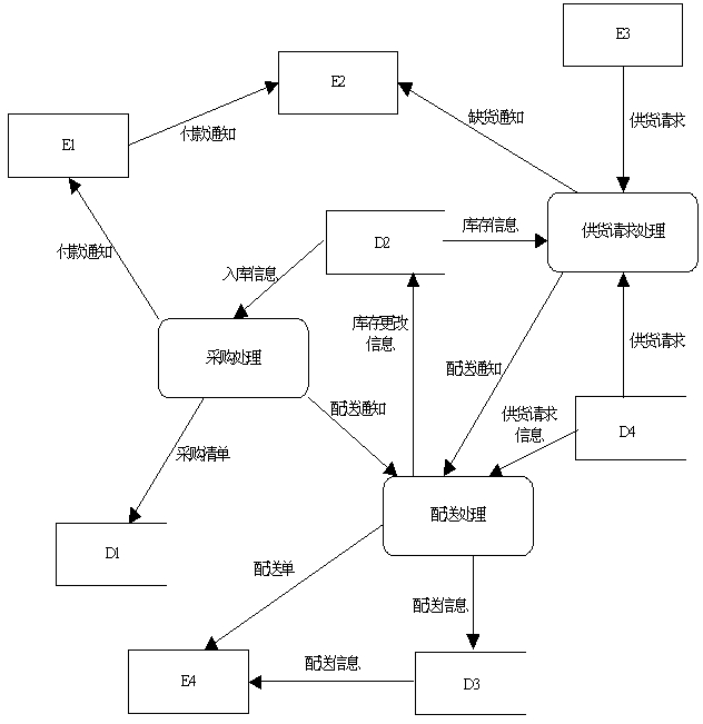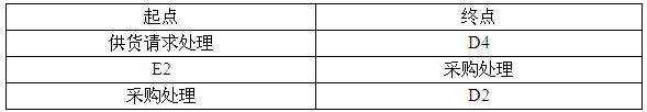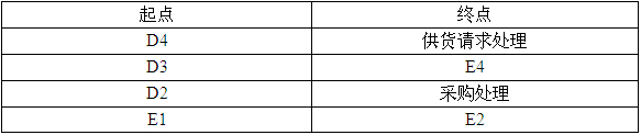 由说明中的第(4)条中“同时通知财务部门给供货商支付货款”,很容易判断出E1是财务部门。同时,E2和E1之间的连线纯属多余。